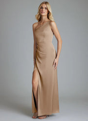 Elegant One-Shoulder Bridesmaid Dresses with Ruched Waist Detail, Daring High Slit and Form-Fitting Satin Maxi Silhouette Formal Gown - US 2 / UK 6 / EU 32