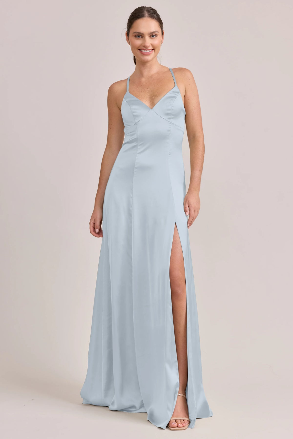 Elegant Sweetheart Neck Spaghetti Strap Satin A-Line Bridesmaid Dress with Cross Back & High Slit in Sky Blue