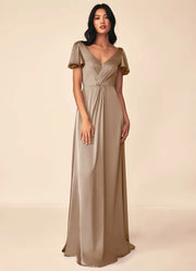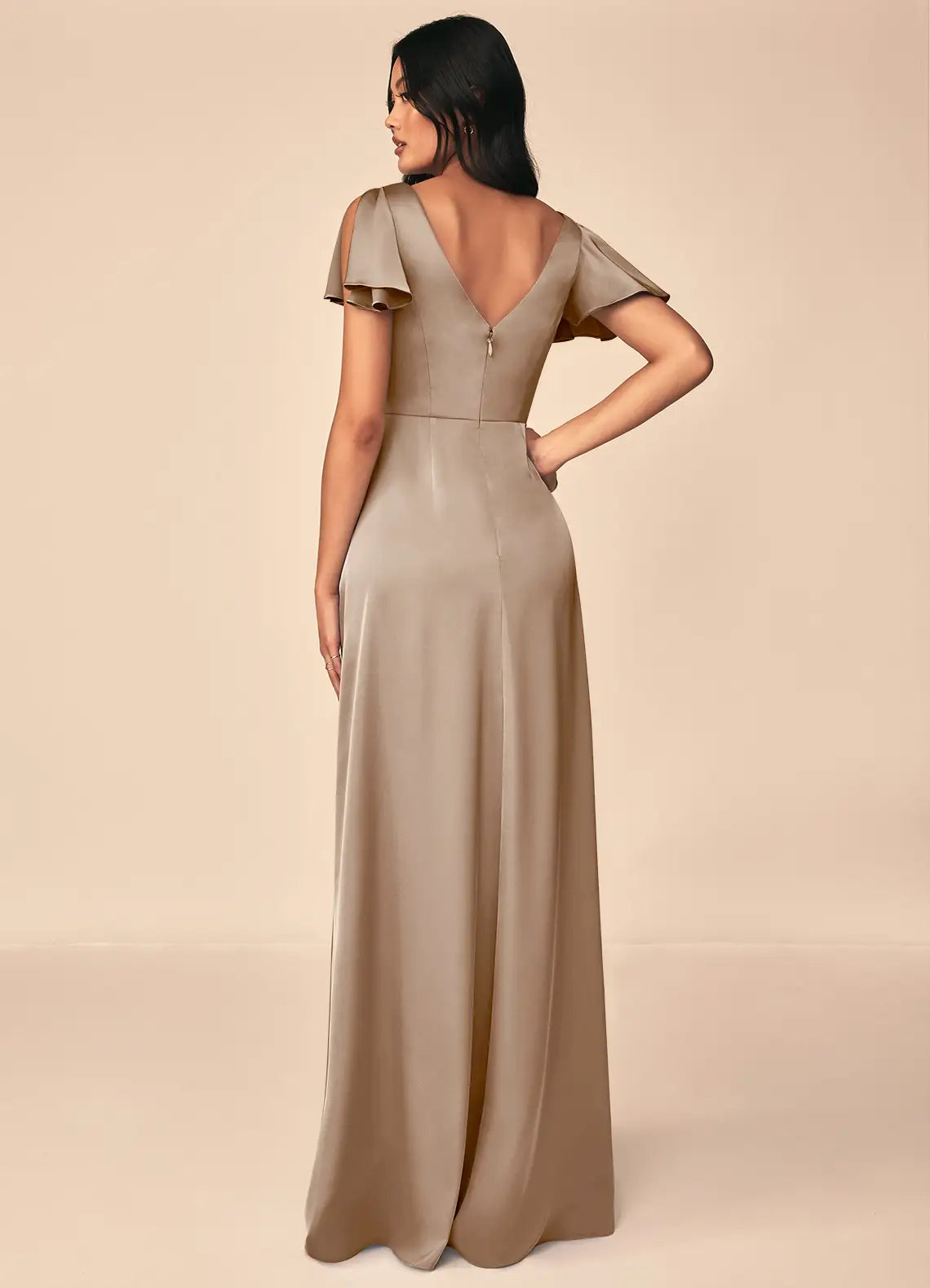 Create a timeless and romantic bridal party look with this elegant taupe satin bridesmaid dress. Crafted from luxuriously smooth satin, it features a flattering V-neckline with delicate ruching, airy flutter sleeves for soft movement, and a flowy A-line skirt that skims the ankles. The subtle pleated detail at the waist offers a tailored fit, making it perfect for garden weddings, black-tie receptions, and formal evening events.