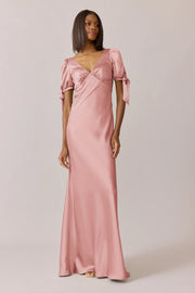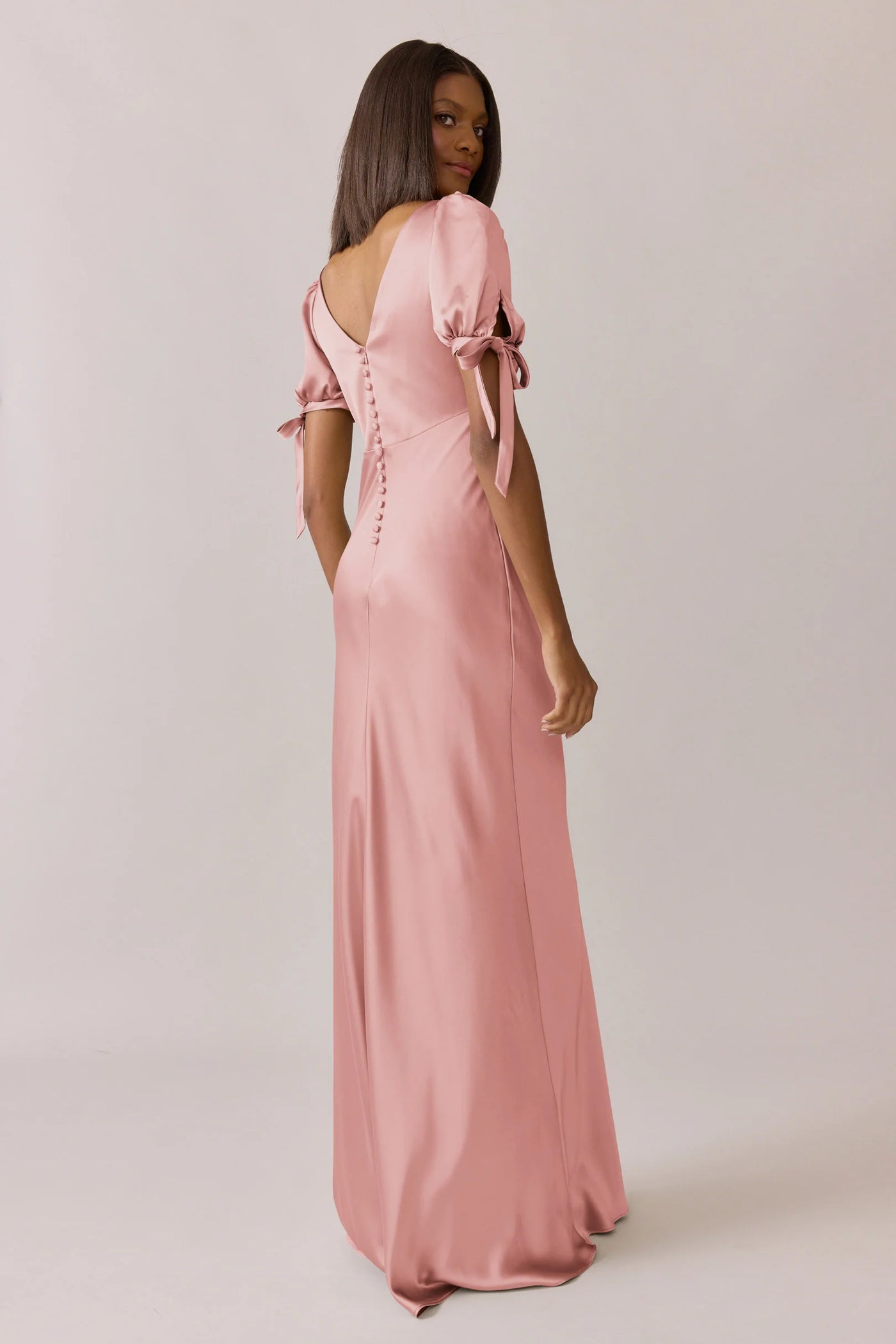 Luxe Satin V-Neck Tie Detail Puff Sleeve A-Line Bridesmaid Dress with Pockets Button Back Floor-Length Hem