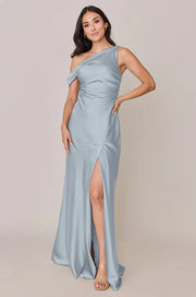 Modern One-Shoulder Satin Mermaid Bridesmaid Dress with Cutout Detail & High Slit in Sky Blue