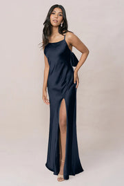 Satin Cowl-Neck Bridesmaid Dress with Spaghetti Straps, High Thigh Slit & Bow-Accented Open Back