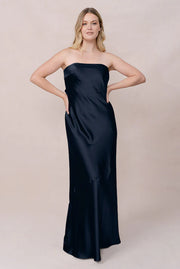 Sleek Strapless Satin Mermaid Bridesmaid Dress with Back Cutout & Pockets