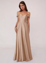 Crafted from luxe taupe satin, this bridesmaid dress features a romantic off-the-shoulder neckline with subtle puffed sleeves and a structured sweetheart bodice. The flowing A-line skirt includes convenient side pockets, blending timeless elegance with modern practicality for your bridal party.