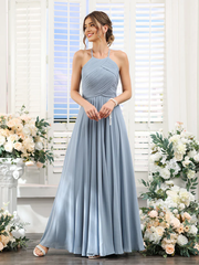 Chiffon Halter Neck Ruched Bodice A-Line Floor-Length Elegant Bridesmaid Dress - Dusty Blue
