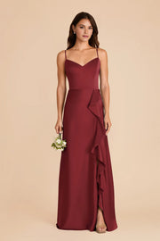 This elegant burgundy bridesmaid dress features a sleek sheath silhouette crafted from luxe satin fabric. The sweetheart neckline and delicate spaghetti straps add soft allure, while the ruffled side detail elevates the design. A thigh-high slit ensures easy movement, and the zipper-back & floor-length hem create a polished, formal look—perfect for weddings or receptions.