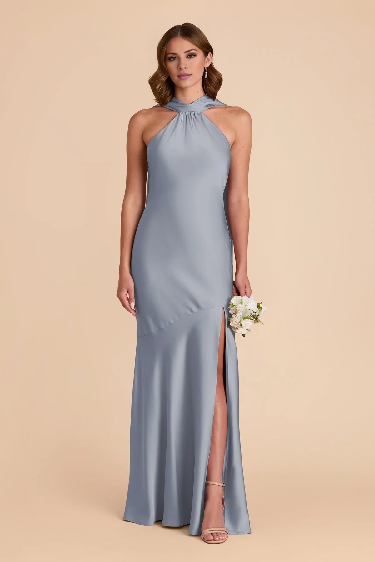 This dusty blue maxi bridesmaid dress features a lustrous satin silhouette, a sleek halter neckline (with a dramatic draped sash detail), and a high side slit for movement. The elegant design balances sophistication and allure—ideal for formal weddings, evening receptions, or upscale bridal events, creating a cohesive, showstopping look for bridal party ensembles.