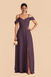 This chic plum gown features an off-shoulder neckline, delicate spaghetti straps, and a lightweight chiffon silhouette with a subtle high slit. The flowing fabric delivers a soft drape, while the V-neck design balances elegance and allure—ideal for weddings, bridal parties, or upscale evening events.