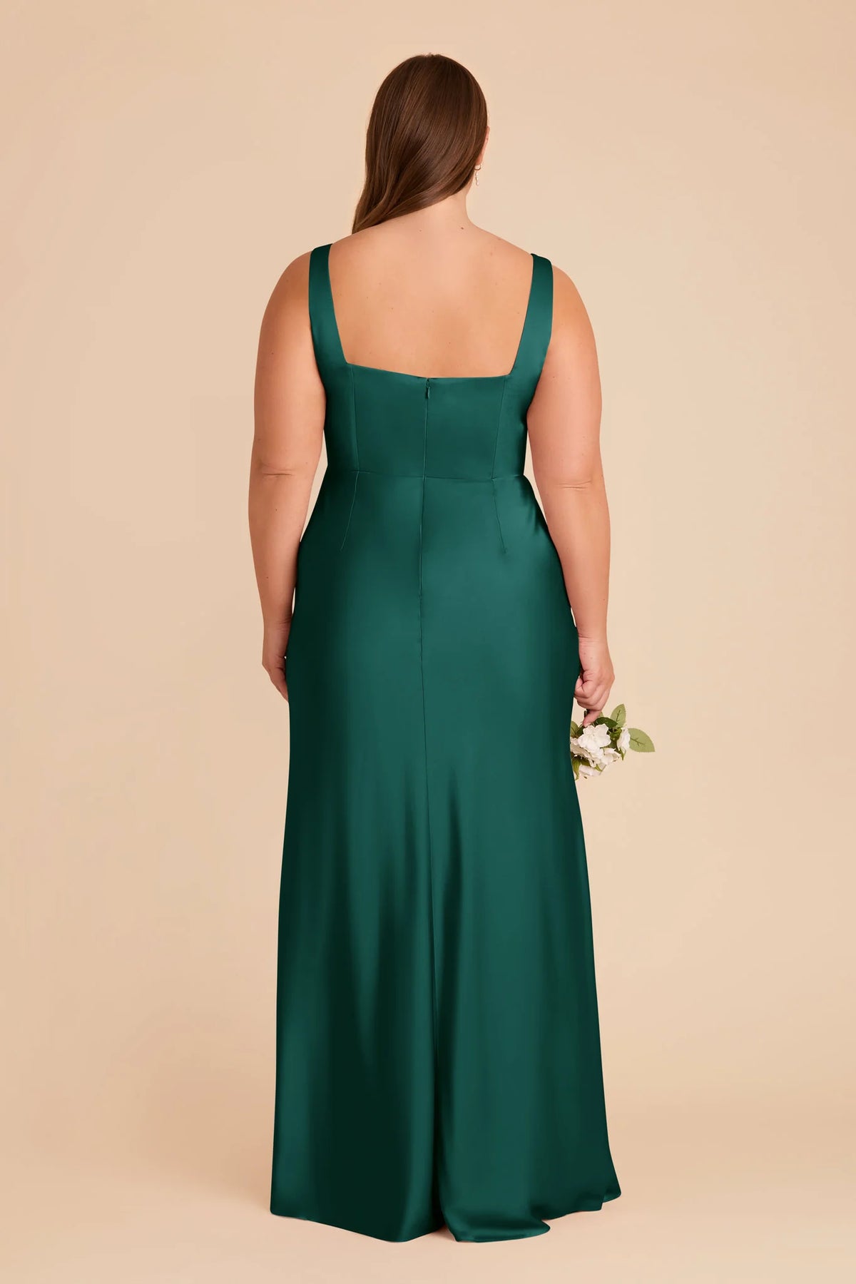 This chic emerald gown features square neckline, decorative bow straps, and a sleek satin silhouette with a subtle high slit. The back cutout and form-fitting design balance elegance and playfulness, while the smooth fabric delivers a rich sheen—ideal for weddings, bridal parties, or upscale evening events.