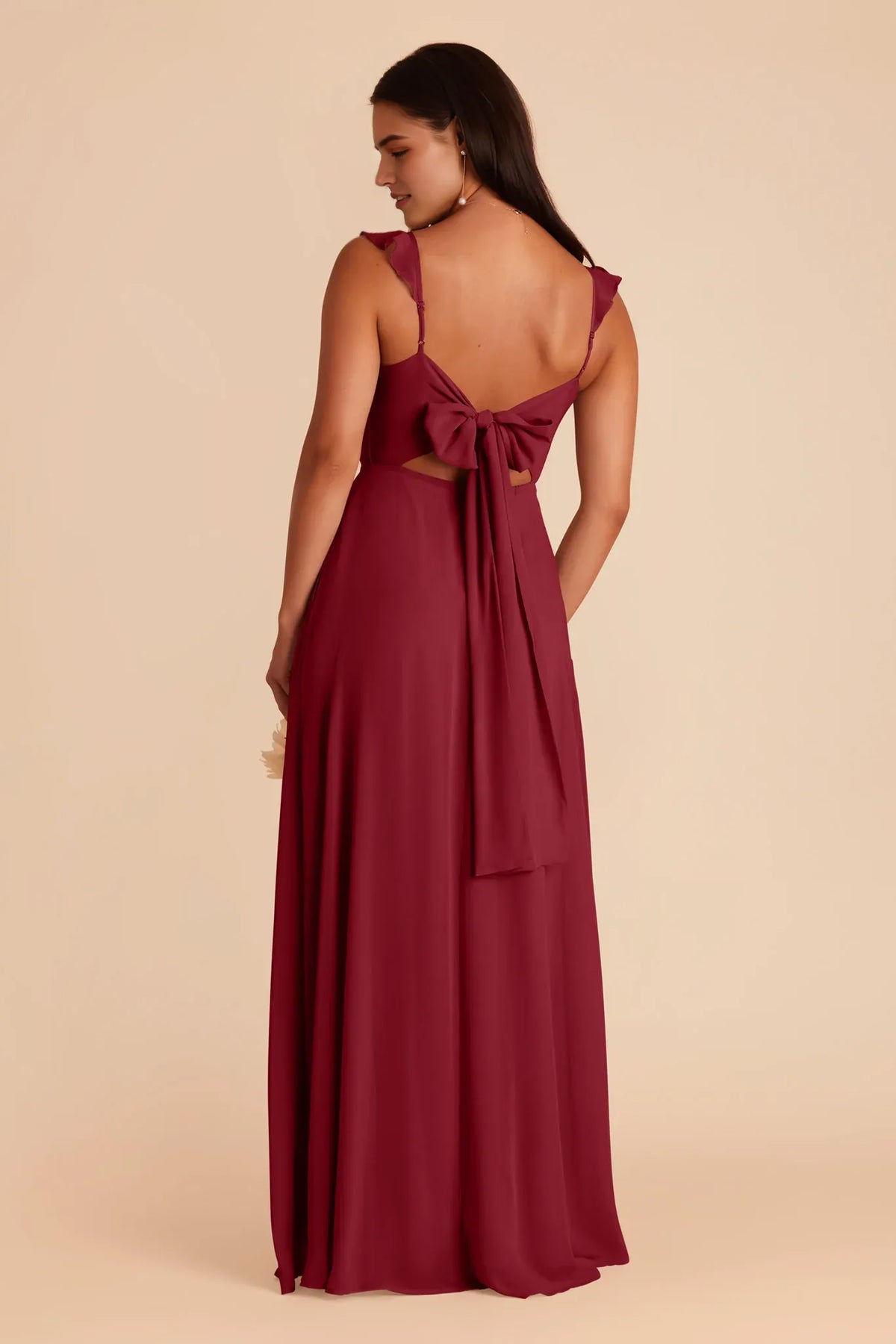 This romantic burgundy bridesmaid dress features a flowing A-line silhouette crafted from lightweight chiffon. The V-neck and delicate ruffled straps add feminine charm, while the bow-accented cutout back brings playful allure. A thigh-high slit ensures easy movement, and the floor-length hem drapes gracefully—perfect for weddings, receptions, or formal celebrations.