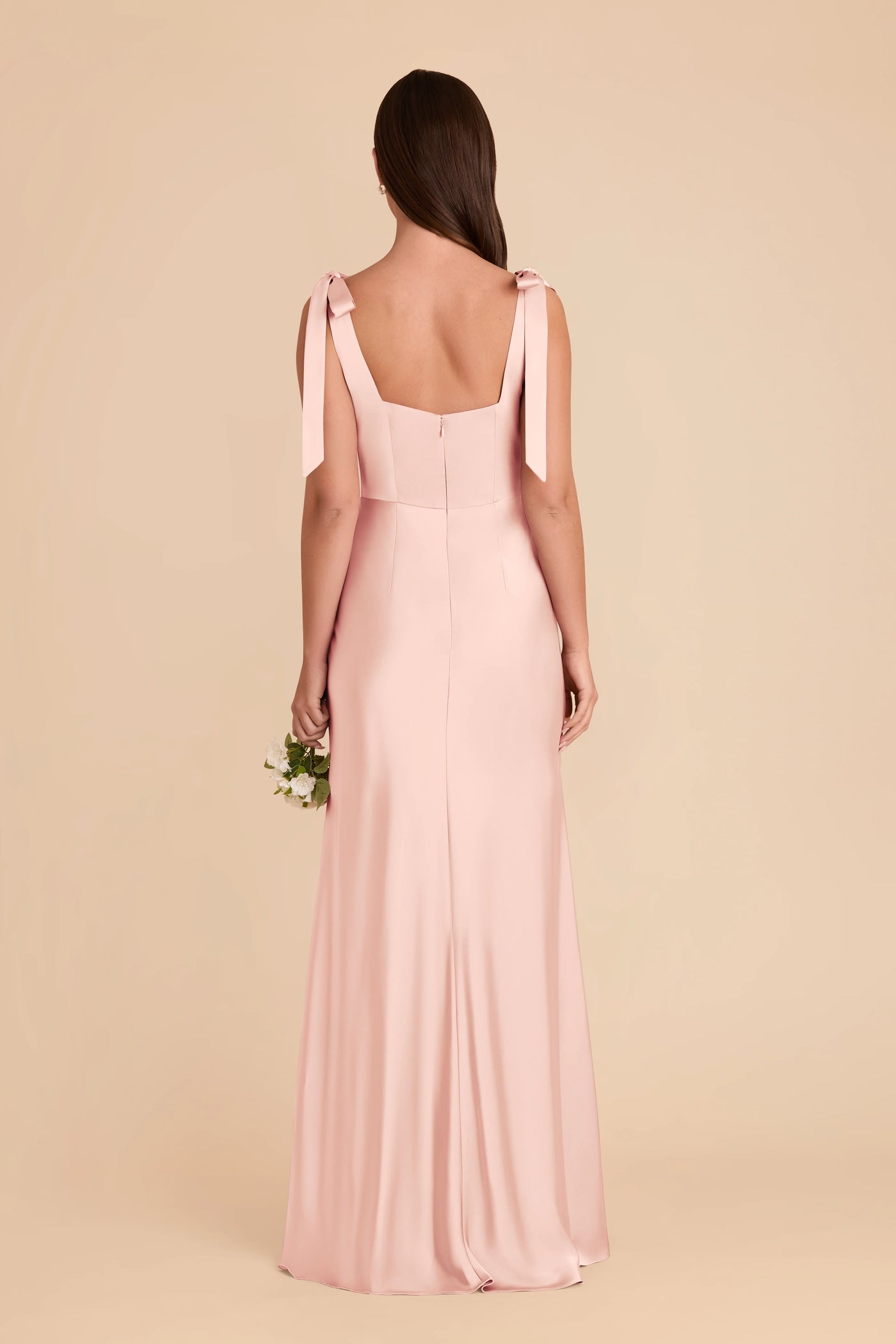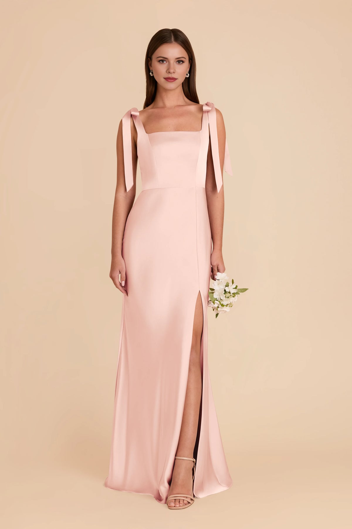 This romantic blush bridesmaid dress features a sleek sheath silhouette crafted from luxe satin fabric. The square neckline and bow straps add feminine charm, while the open back brings subtle allure. A thigh-high slit ensures easy movement, and the floor-length hem drapes smoothly—ideal for weddings, receptions, or formal celebrations.