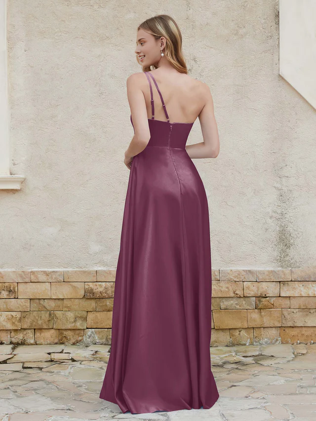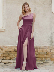 Satin One-Shoulder Ruched Bodice Pocketed High-Slit A-Line Floor-Length Bridesmaid Dresses - Mulberry