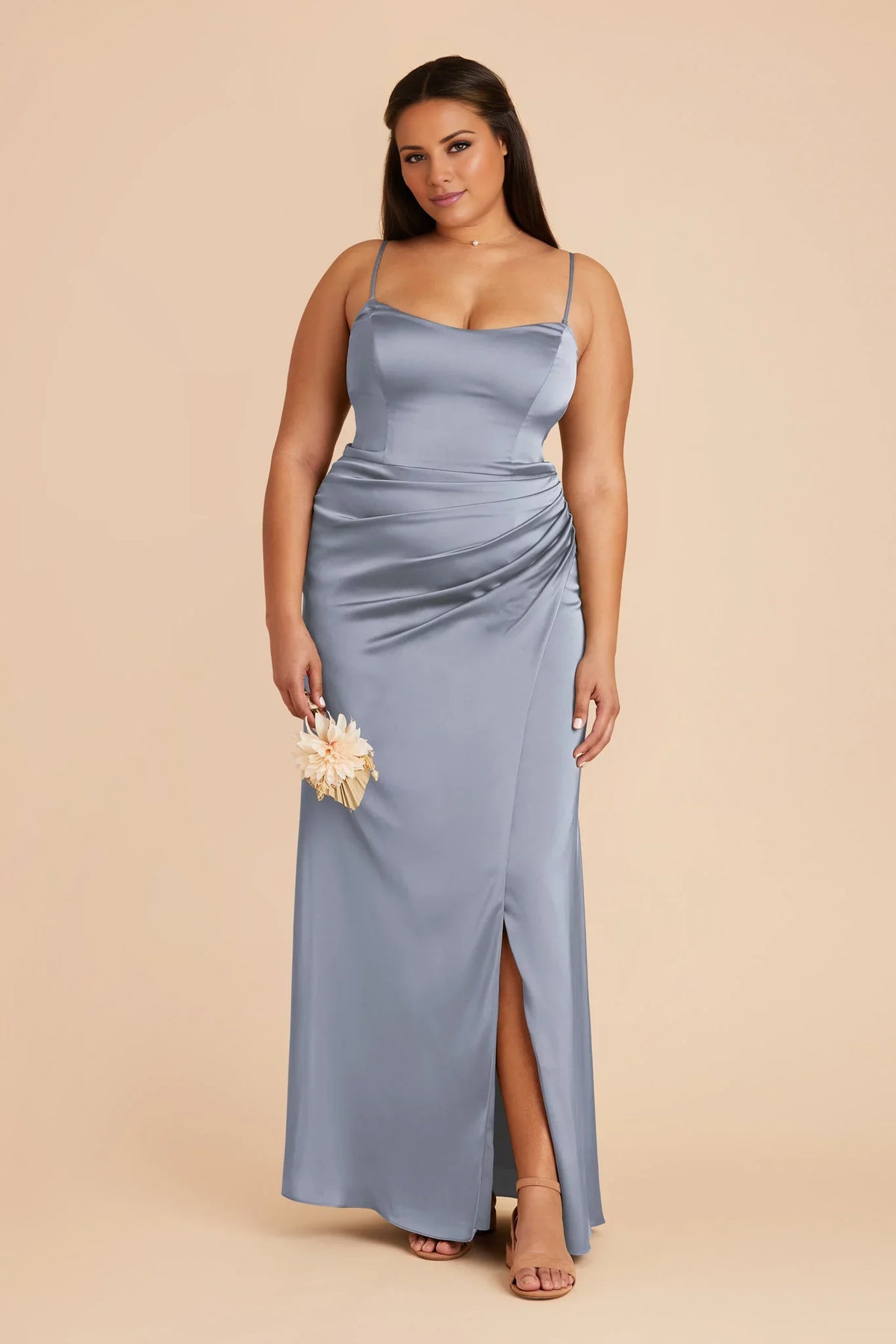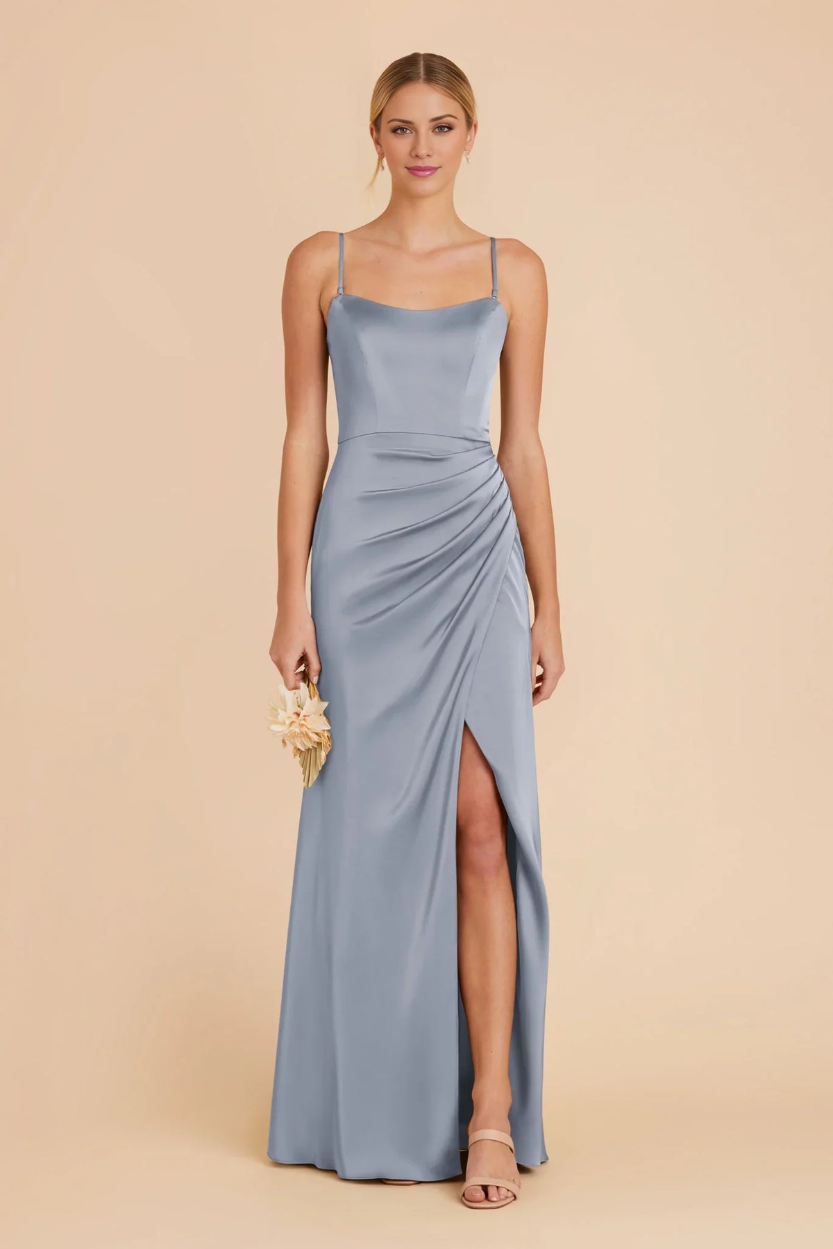 This dusty blue maxi bridesmaid dress features a lustrous satin silhouette, a crisp square neckline, delicate spaghetti straps, and a ruched waist detail (for a figure-flattering fit) paired with a high side slit. The smooth fabric and modern design balance sophistication and allure—ideal for formal weddings, evening receptions, or upscale bridal events, creating a cohesive, polished look for bridal party ensembles.