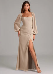 This romantic bridesmaid dress features a structured square neckline with delicate beaded trim, complemented by billowy sheer puffed sleeves that add a dreamy touch. The ruched waist accentuates the figure, while the open back with a bow detail and high front slit create modern allure. Crafted from luxe satin, it’s perfect for formal wedding parties, black-tie events, and special occasions, blending vintage charm with contemporary elegance.