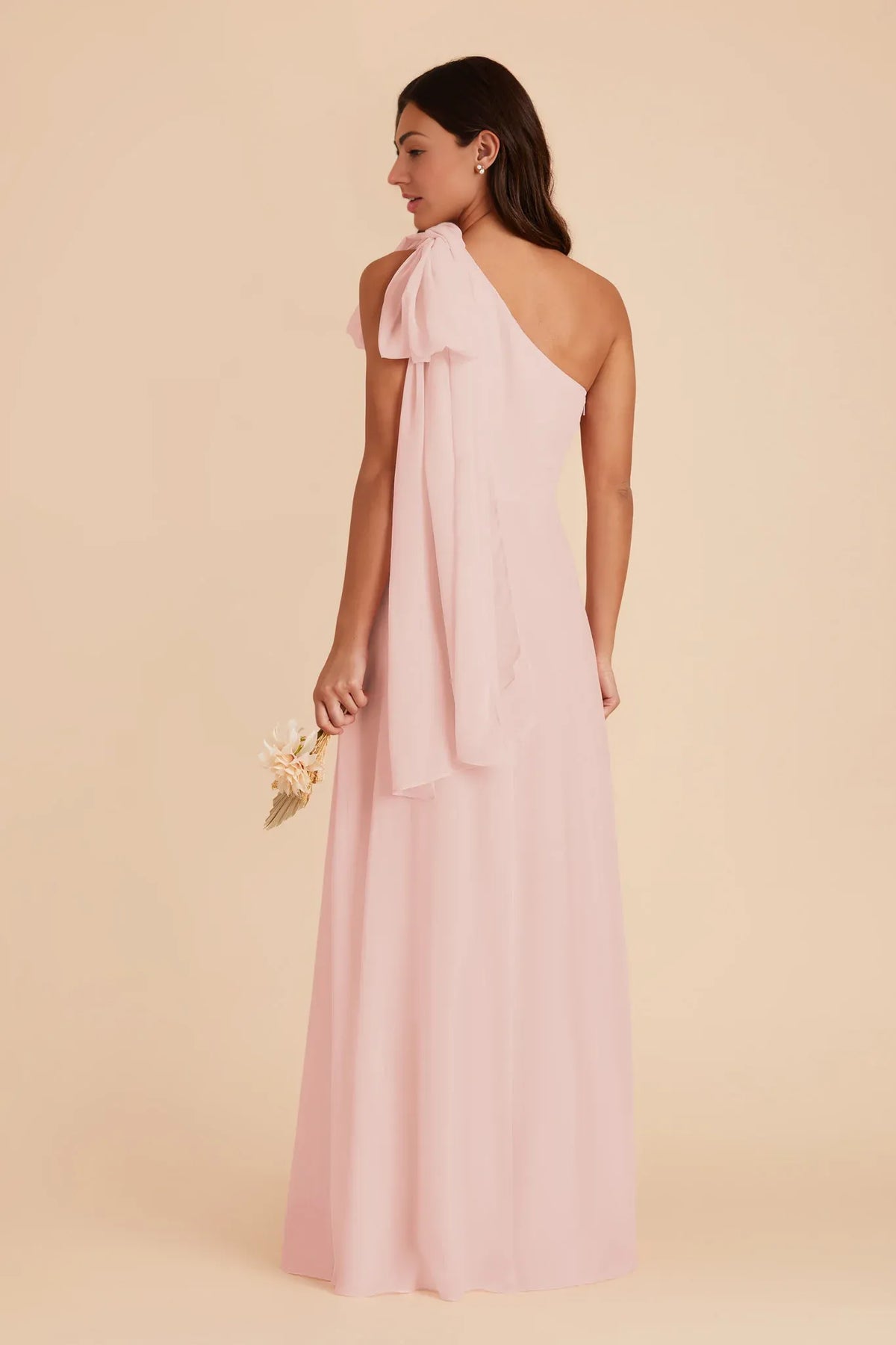 This charming blush bridesmaid dress features a flowing A-line silhouette crafted from lightweight chiffon. The one-shoulder neckline and dramatic bow sleeve add feminine flair, while the open back brings subtle allure. A thigh-high slit ensures easy movement, and the floor-length hem drapes gracefully—perfect for weddings, receptions, or formal celebrations.