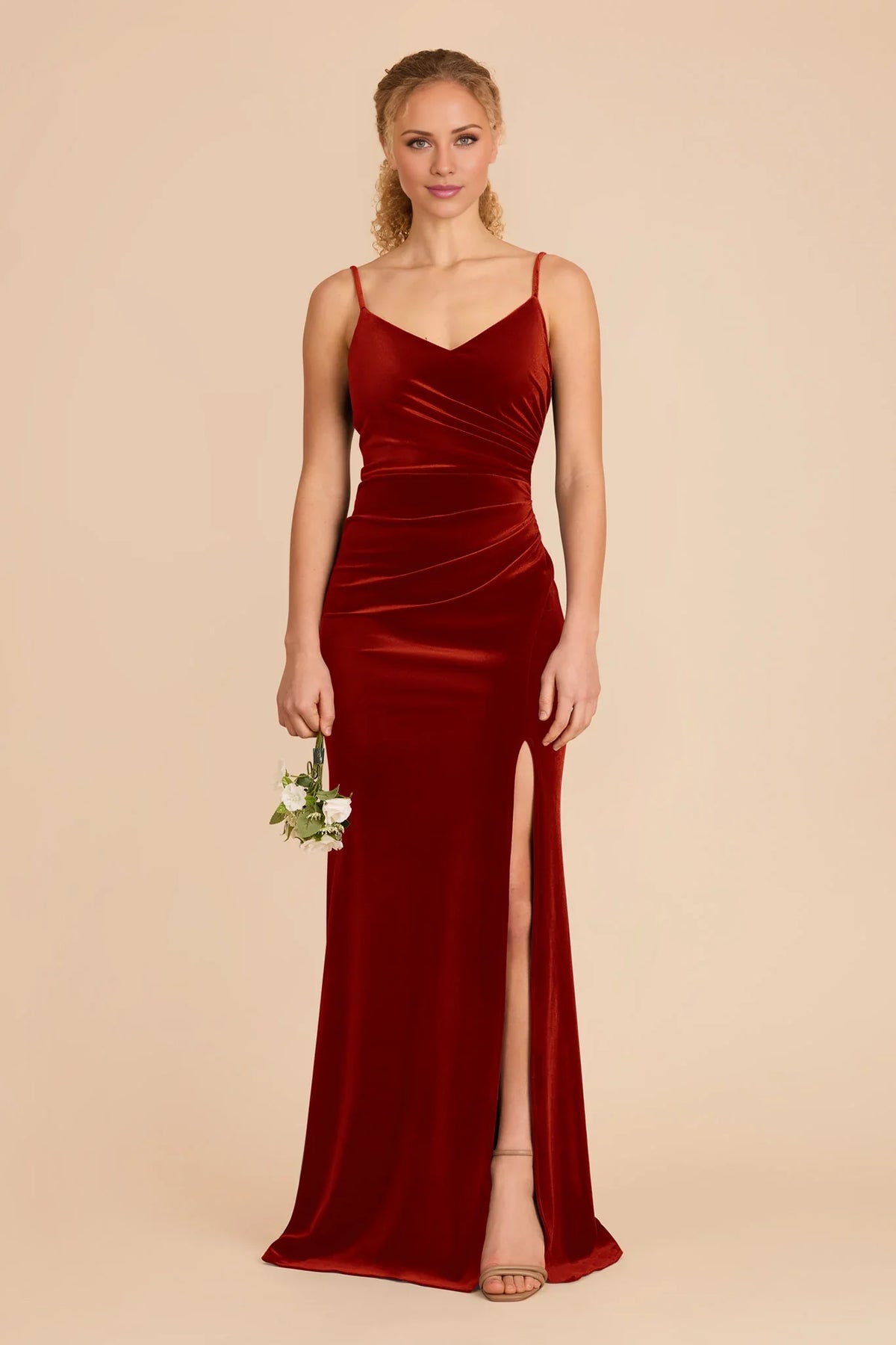 This burnt orange dress (tailored for bridesmaids) features a figure-flattering maxi silhouette crafted from rich, soft velvet, delicate spaghetti straps, and a V-neckline paired with ruched detailing that accentuates curves. The side slit adds graceful movement—ideal for wedding ceremonies, receptions, or formal bridal events. Its warm, vibrant hue brings a bold yet cohesive touch to bridal party ensembles.
